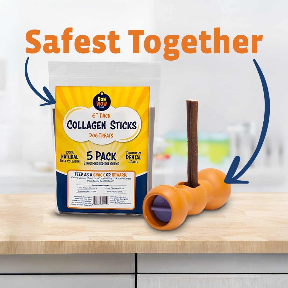 The Smart Collagen Stick Bundle is a convenient way to promote whole body health and start safe chewing habits with puppies and dogs. The Bow Wow Buddy® Safety Device secures collagen sticks to help prevent pups from choking on the last bite of the stick. To fill the holder, you’ll get five SafeFit® Collagen Sticks that have been hand-selected to fit securely in the Bow Wow Buddy®.